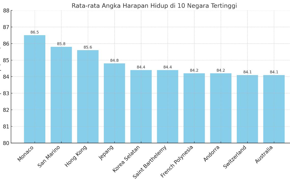 Berdasarkan data United Nations pada 2024, Monaco menjadi negara dengan rata-rata usia hidup tertinggi di dunia, mencapai 86,5 tahun.