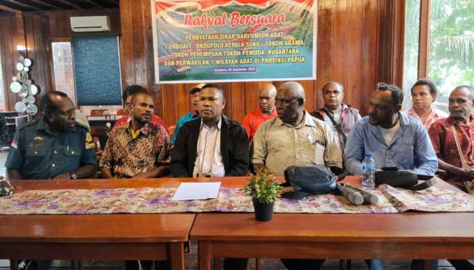 Pernyataan sikap ini dibacakan Ondofolo Ismail Ishak Mebri yang juga Ketua Presidium Masyarakat Adat Tabi. Ia menyampaikan bahwa sejatinya seluruh tahapan PSU Pilgub Papua sudah berjalan aman, tertib, serta jujur dan adil di 9 kabupaten/kota. Dan disitu rakyat telah memilih calon Gubernur Papua definitif yakni Matius Fakhiri – Aryoko Rumaropen.