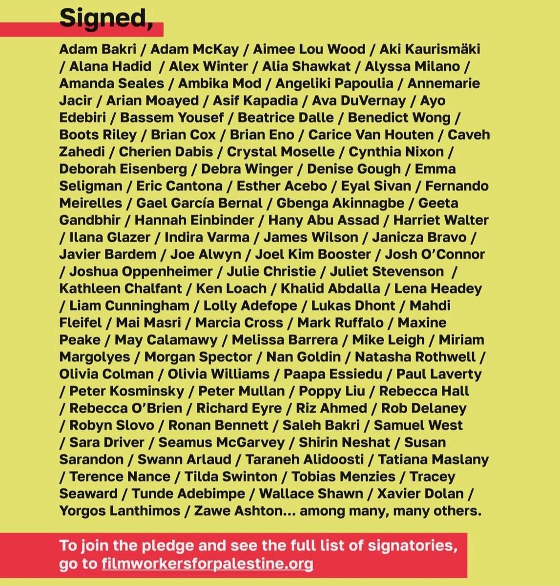 Para penandatangan termasuk sineas Yorgos Lanthimos, Ava DuVernay, Asif Kapadia, Boots Riley, dan Joshua Oppenheimer; serta aktor Olivia Colman, Mark Ruffalo, Tilda Swinton, Javier Bardem, Ayo Edebiri, Riz Ahmed, Josh O’Connor, Cynthia Nixon, Julie Christie, Ilana Glazer, Rebecca Hall, Aimee Lou Wood serta Debra Winger.