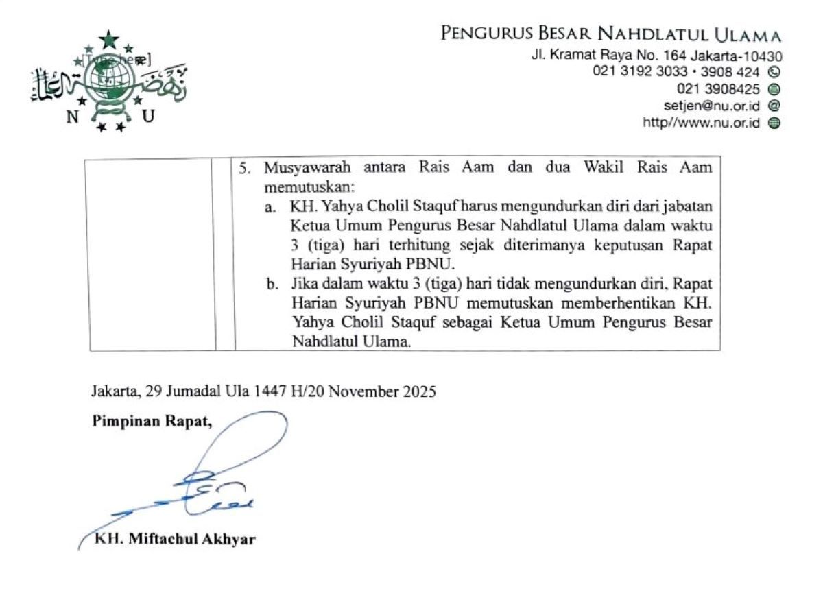 Dokumen resmi yang ditandatangani oleh Rais Aam PBNU KH Miftachul Akhyar tersebut memuat sejumlah pertimbangan penting yang menjadi dasar rekomendasi agar Gus Yahya segera melepas posisi kepemimpinan di PBNU.