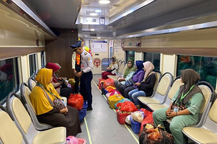 Pantauan menggapaiasa.comdi atas kereta, petugas meminta para pedagang menata barang bawaan di lantai, tepat di bawah kursi, agar tidak mengganggu jalur jalan dan tetap mudah diawasi selama perjalanan.