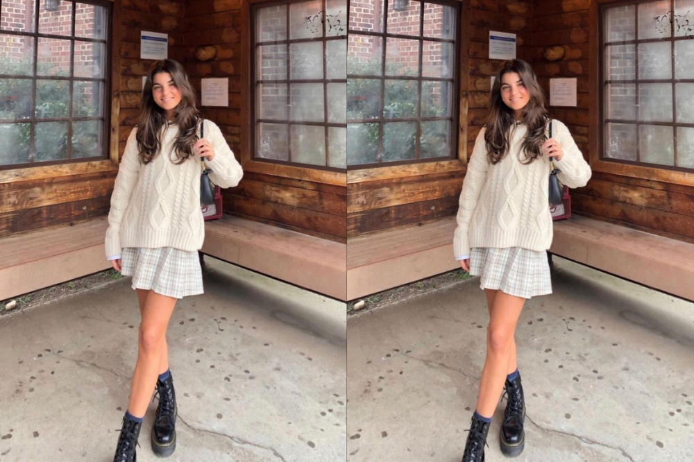 10. Sweater rajut oversized dengan mini-skirt preppy