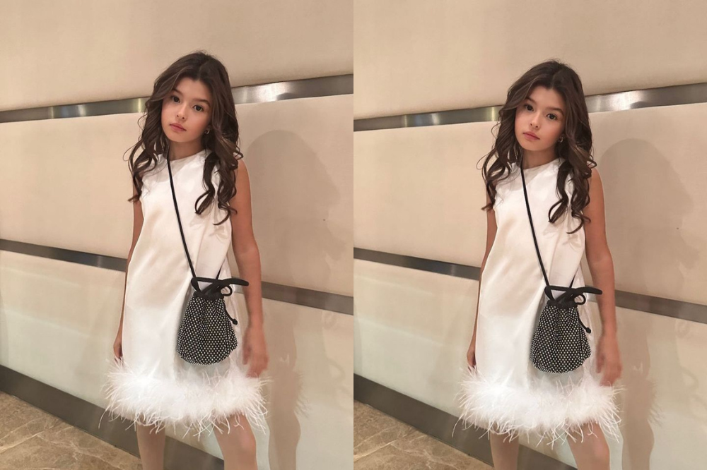 Tampilan ini lebih glam, cocok untuk remaja yang ingin tampil sedikit ekstra di momen Natal malam. Mini dress putih tanpa lengan dengan aksen feather di bagian hem membuat look ini terasa mewah tapi tetap sesuai usia.