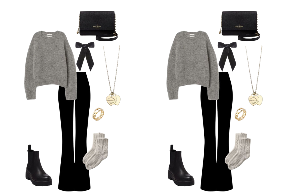 Tampilan ini memadukan sweater abu-abu oversized yang nyaman dengan celana hitam flare yang memberi sentuhan elegan namun santai. Aksesoris seperti pita hitam di leher dan tas crossbody menambah detail klasik, sementara sepatu boots hitam dengan sol chunky melengkapi look yang stylish dan hangat untuk Natal.