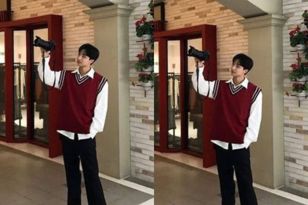 Look ini pas untuk remaja yang ingin tampil rapi tanpa terasa terlalu formal. Kemeja putih lengan panjang menjadi dasar yang bersih, sementara vest marun dengan garis-garis di bagian leher dan lengan menambah sentuhan preppy ala sekolah swasta klasik.