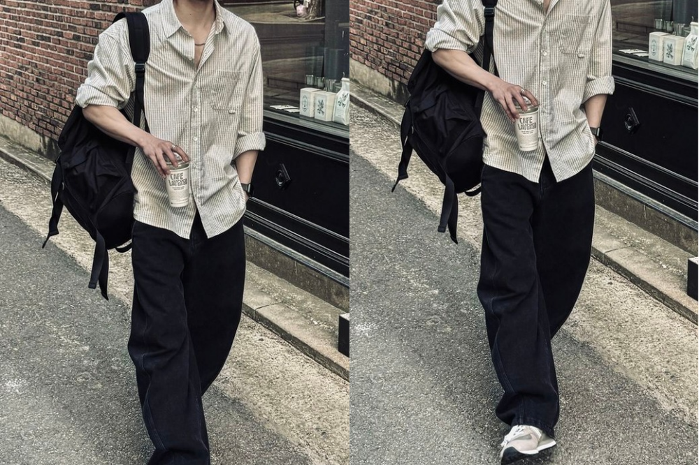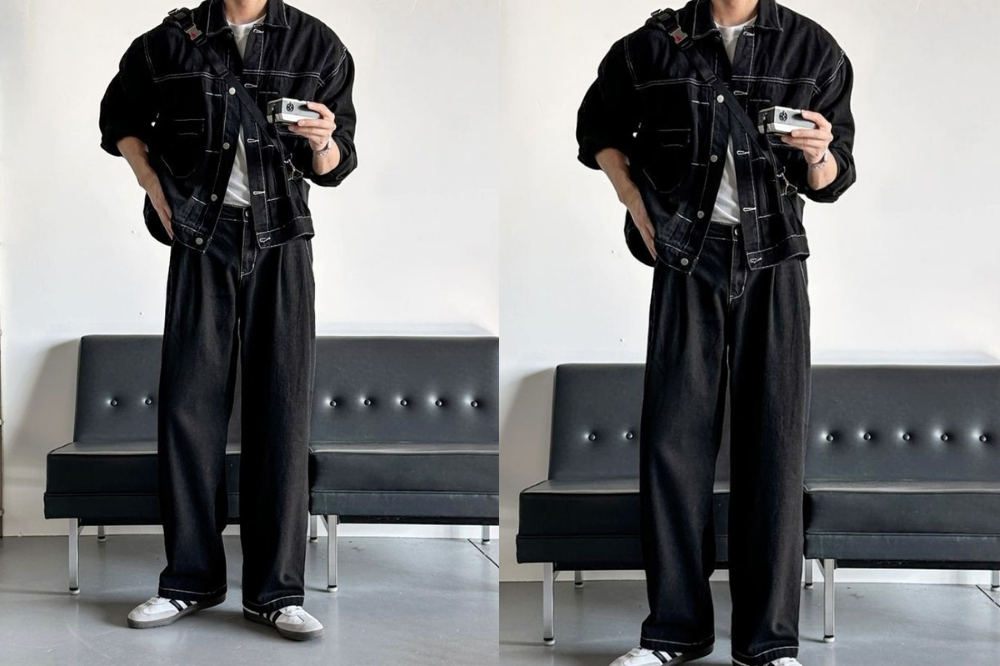 5. Tampilan streetwear gelap dengan jeans wide-leg yang keren