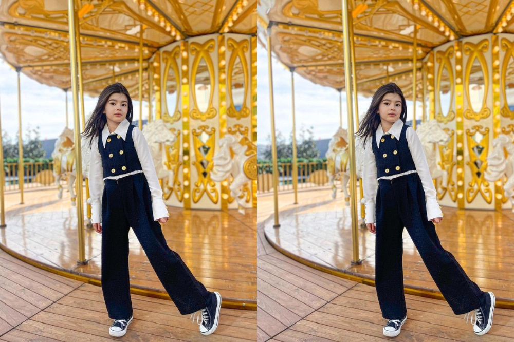 Dipadukan dengan celana jeans baggy warna abu gelap, tampilan ini terasa kekinian tanpa terlihat berlebihan. Sepatu kanvas hitam jadi pelengkap yang menjaga keseluruhan outfit tetap ringan dan mudah dipakai ke mana saja, baik itu ke acara Natal di sekolah, nongkrong bareng teman, atau sesi foto keluarga.