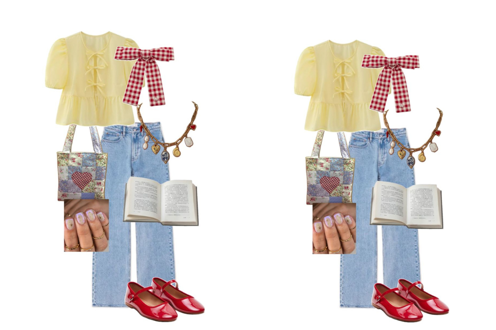 Outfit ini memadukan atasan gingham merah yang manis dengan celana jeans longgar berwarna terang, menciptakan kesan kasual namun tetap chic. Sepatu ballet merah menambahkan sentuhan feminin klasik, sedangkan aksesoris seperti tas cokelat dan jepit rambut merah membuat tampilan lebih harmonis.