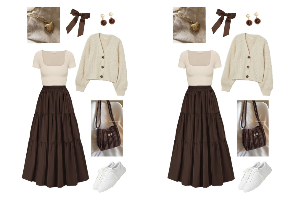 Outfit ini memadukan nuansa klasik dan vintage dengan sentuhan cozy. Cardigan krem oversized memberi kesan hangat, sementara rok maxi cokelat bertingkat menambah siluet flowy yang anggun.