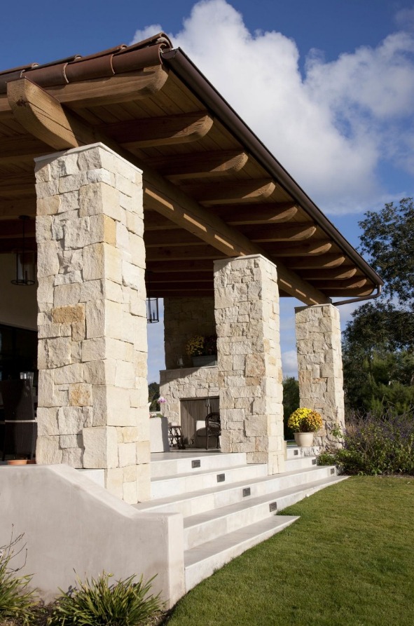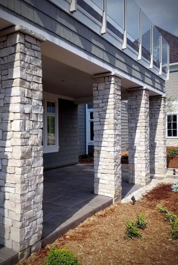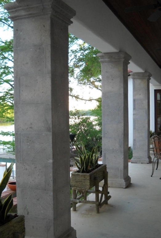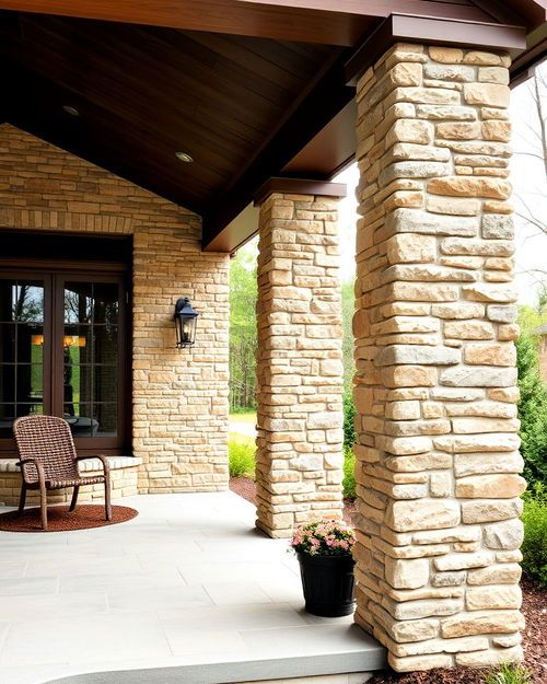 Selain itu, bentuk kotak memberikan fleksibilitas dalam pemasangan berbagai material batu alam karena permukaan datarnya mendukung pemasangan motif atau pola batu secara presisi. Hal ini membuat hasil akhirnya terlihat lebih menyatu dan estetis. Dari sudut pandang desain, tiang kotak dapat membingkai area teras dengan struktur yang jelas sehingga menciptakan focal point yang kuat dan meningkatkan nilai visual rumah secara keseluruhan.