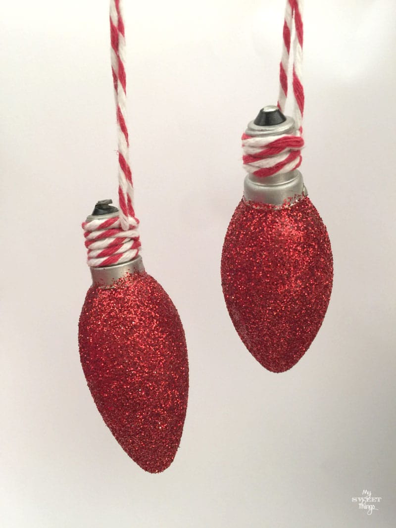 Hiasan Natal dari barang bekas berikutnya bisa Anda buat dari bola lampu atau lampu bohlam bekas. Alih-alih membuangnya, lampu bohlam yang sudah tidak terpakai bisa Anda mengubahnya menjadi dekorasi Natal cantik dan ramah lingkungan. Cara membuatnya sangat mudah, lapisi permukaan lampu dengan lem Mod Podge, yaitu lem kerajinan kuat yang dapat menempel dengan baik pada permukaan kaca. Kemudian, tempelkan bubuk glitter secara merata pada keseluruhan permukaan lampu. Untuk tampilan yang lebih menarik, gunakan warna glitter berbeda pada setiap bola lampu.
