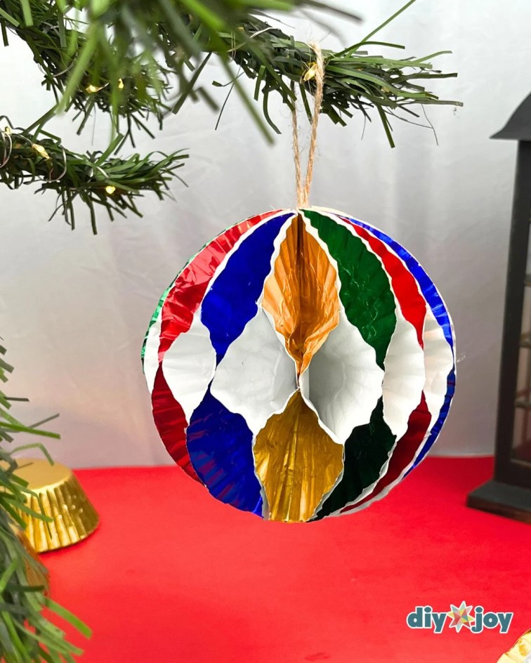 Untuk membuat satu ornamen bola pohon Natal, Anda membutuhkan sekitar 10 alas cupcake. Ulangi cara yang sama untuk semua alas cupcake lainnya. Setelah selesai, satukan dan rekatkan semua lipatan alas cupcake hingga membentuk ornamen bola kertas yang cantik. Terakhir, tambahkan tali rami sebagai gantungan. Ornamen bola ini bisa langsung Anda gantung pada pohon Natal untuk menambah kesan meriah pada dekorasi rumah Anda.