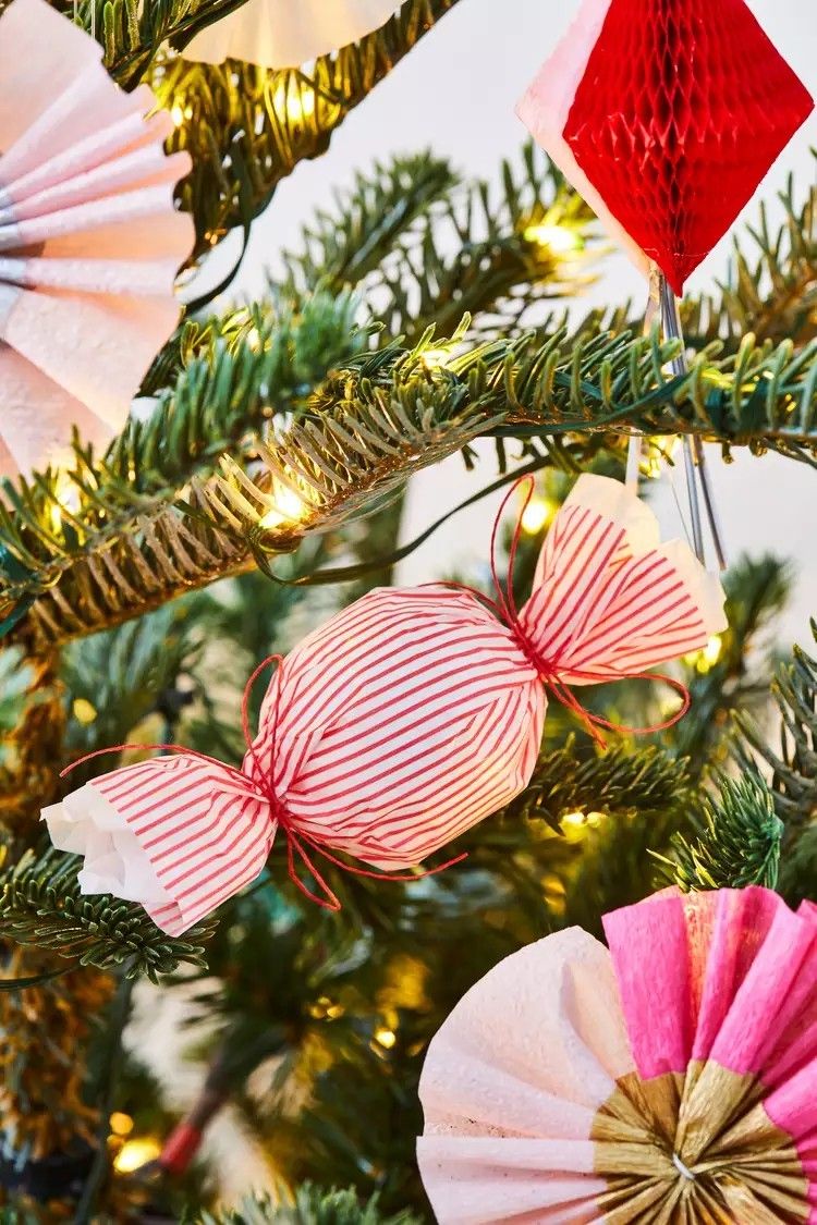 Anda bisa memanfaatkan mainan bola plastik milik Si Kecil yang sudah tidak dimainkannya lagi dan menyulapnya menjadi hiasan Natal dari barang bekas yang menarik! Caranya, potong persegi kertas krep warna-warni atau kertas kado sesuai dengan ukuran bola. Kemudian, letakkan bola plastik di tengah kertas dan bungkus menyerupai permen dengan memutar bagian kanan dan kirinya, lalu ikat menggunakan tali warna-warni.