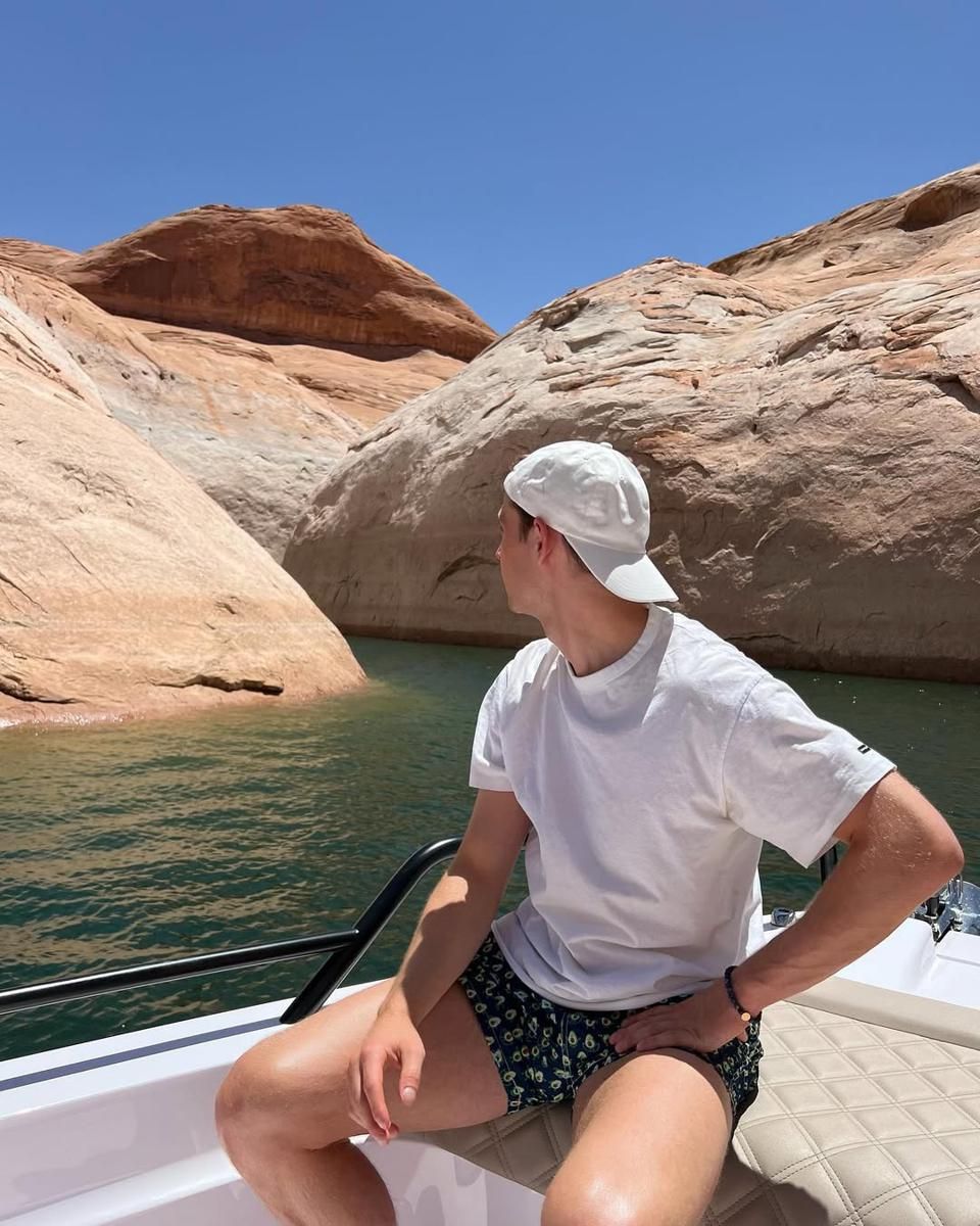 7. White t-shirt dan swim trunks adalah outfit ideal buat berlibur di pantai saat musim panas. Praktis banget!
