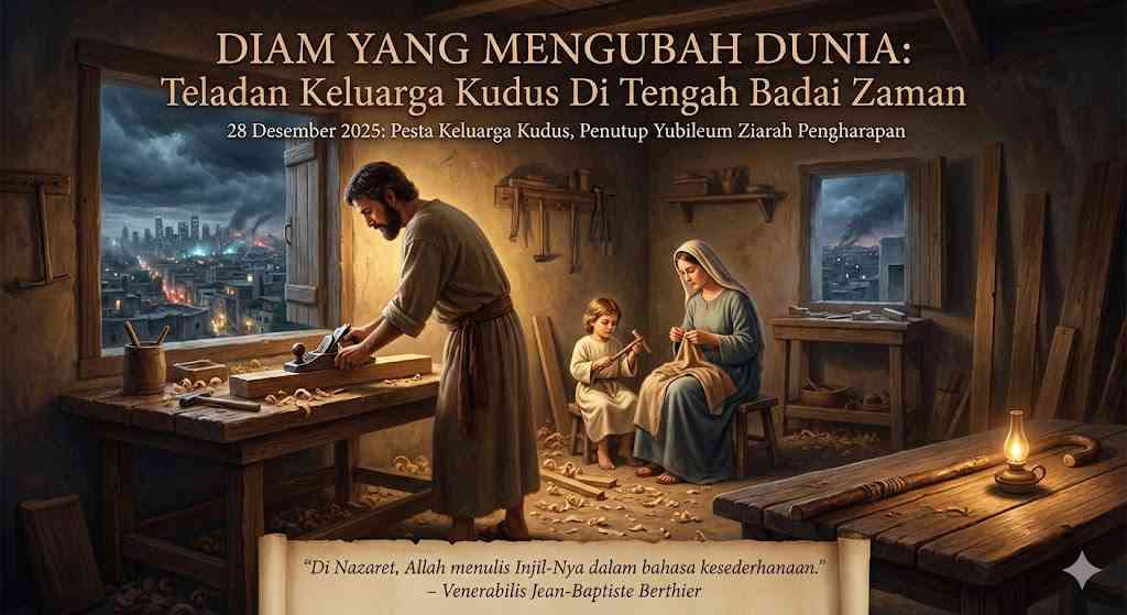 Diam Yang Mengubah Dunia: Teladan Keluarga Kudus Di Tengah Badai Zaman 28 Desember 2025: Pesta Keluarga Kudus, Penutup Yubileum Ziarah Pengharapan "Di Nazaret, Allah menulis Injil-Nya dalam bahasa kesederhanaan," tulis Venerabilis Jean-Baptiste Berthier, sang pejuang keluarga. Hari ini, ketika kita menutup Tahun Yubileum di tengah dunia yang gelisah oleh konflik dan kesepian, suara diam Yusuf (yang tak terdengar dalam Kitab Suci) justru berteriak menggugah hati. Ia mengingatkan kita: Keluarga bukanlah tempat pelarian dari badai, melainkan bahtera yang dibangun dengan tangan yang setia, di mana Allah diam-diam mengubahkan sejarah.