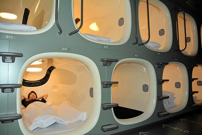Tren hotel kapsul banyak ditemukan di Tokyo, Jepang. Hotel ini menawarkan kamar-kamar kecil berisi kasur.