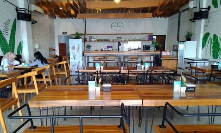 Two Elements Coffee & Kitchen menawarkan konsep kafe sekaligus tempat makan dengan suasana modern. Area duduknya cukup luas dan nyaman, cocok untuk nongkrong bersama teman atau keluarga.