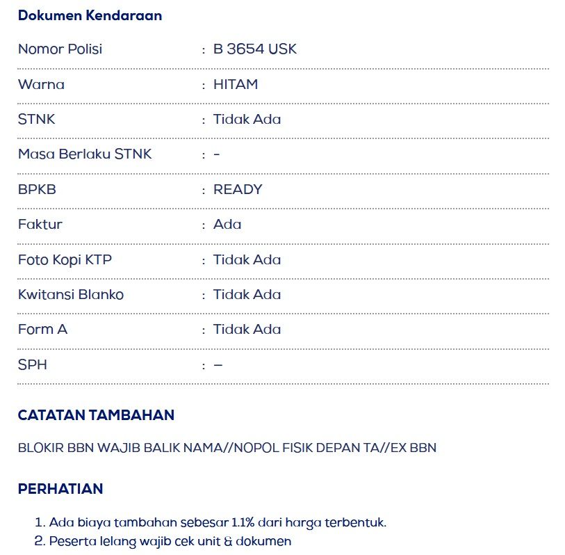 Motor dengan pelat nomor B 3654 USK ini akan dilelang di Jalan Husein Sastra Negara Komplek Pergudangan Nusa Indah - Jurumudi, Tangerang Banten.