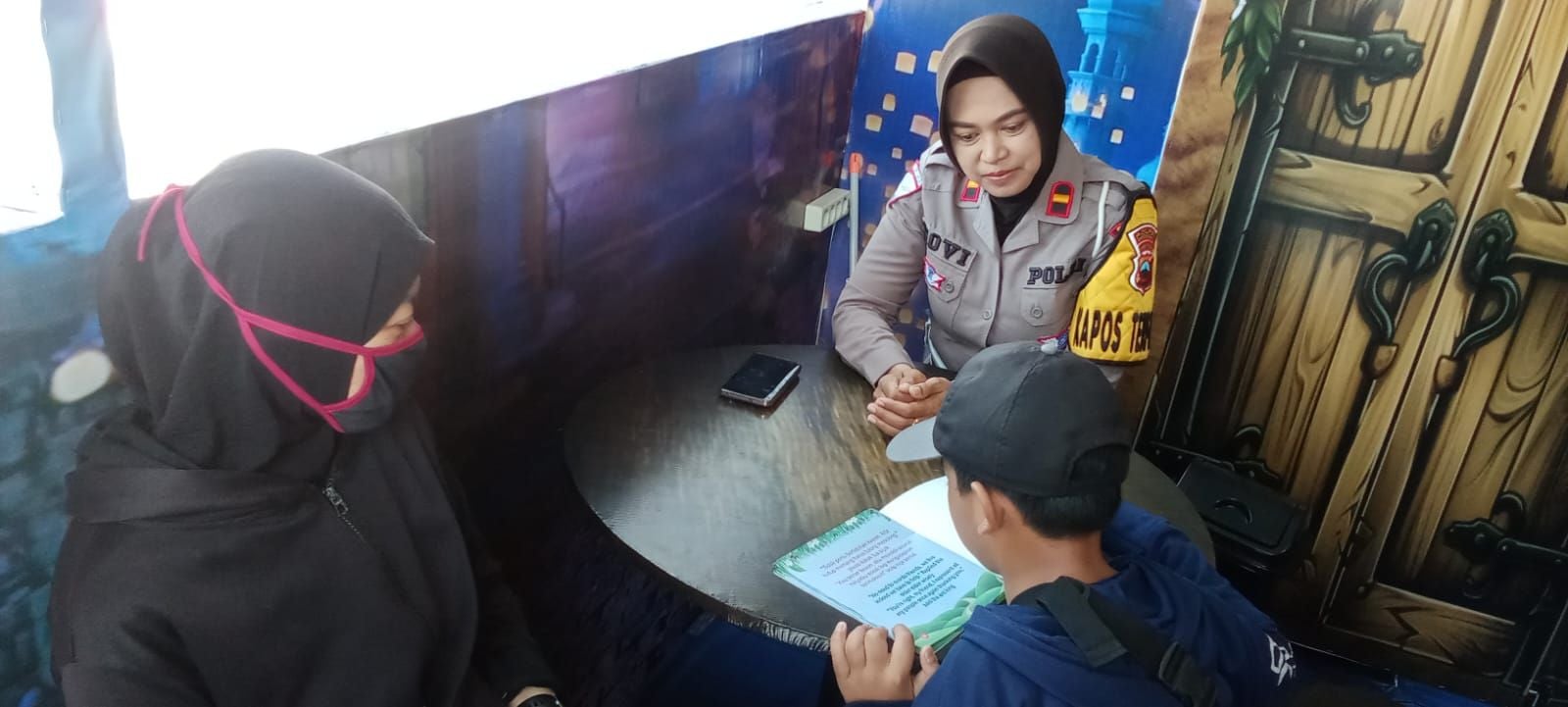 Kepala Pos Terpadu, Ipda Novi Ariani, menyambut anak-anak dengan senyum ramah serta mengajak mereka membaca buku di area perpustakaan mini yang tersedia.