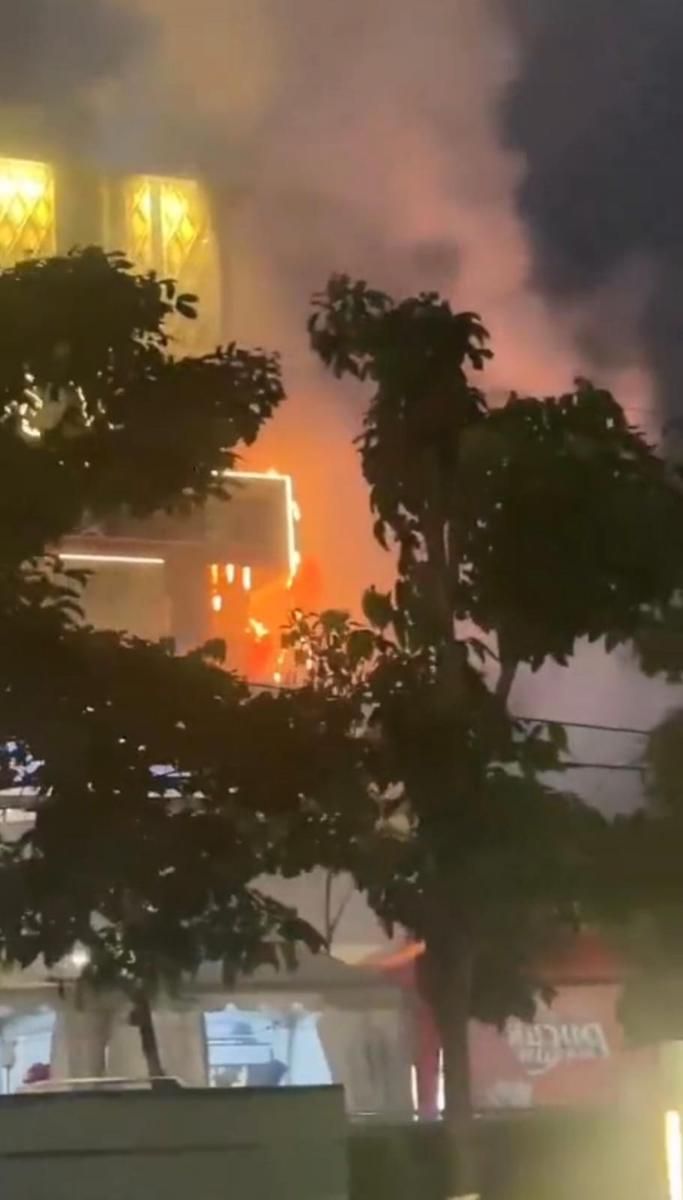 Kebakaran terjadi di bagian dekorasi dengan bentuk pita besar yang letaknya di sudut luar gedung.