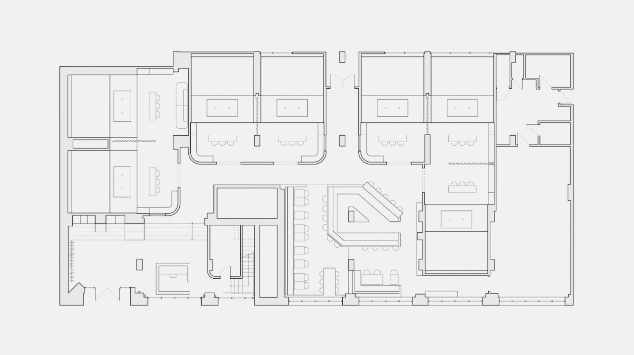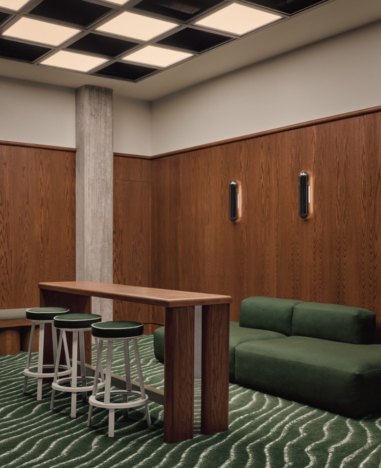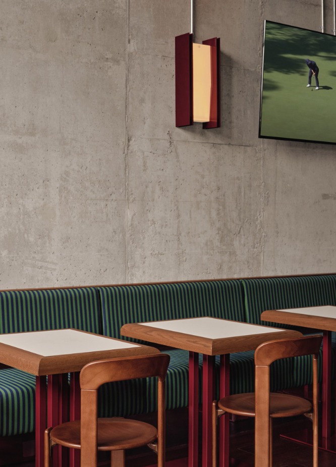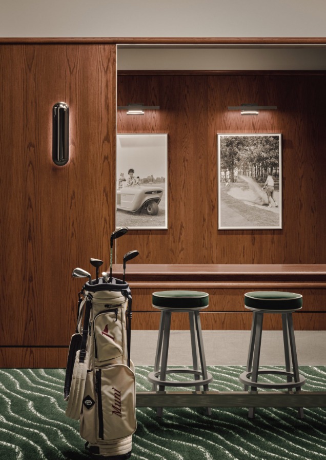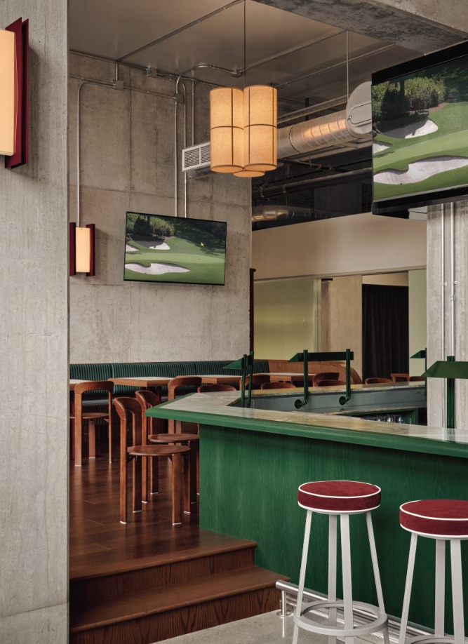 Alih alih tampil seperti fasilitas latihan modern yang dingin, klub golf ini menonjolkan kesan ramah dan intim. Bayangkan ruang industri tua yang dipertahankan karakter aslinya, lalu dipadukan dengan material hangat, warna pekat, pencahayaan lembut, dan sentuhan kemewahan yang subtil. Semua elemen ini menciptakan perpaduan harmonis antara karakter bangunan lama dan visi desain kontemporer yang lebih humanis.