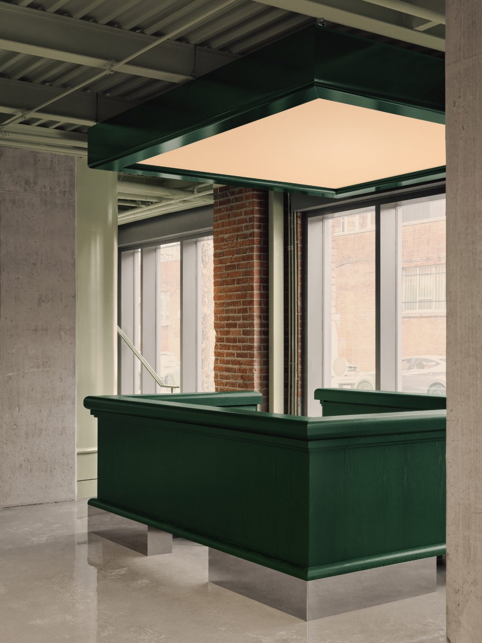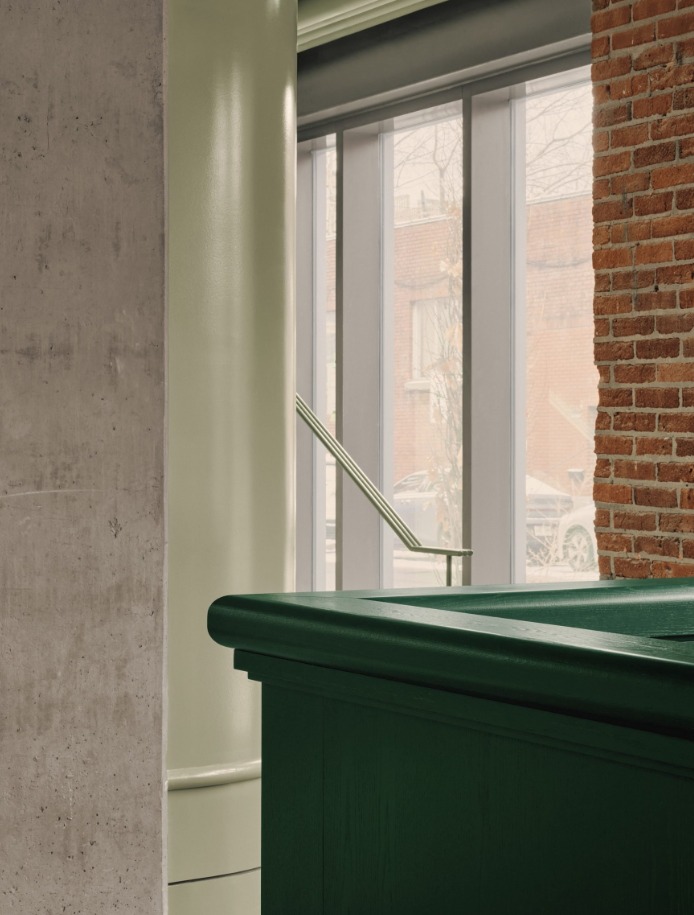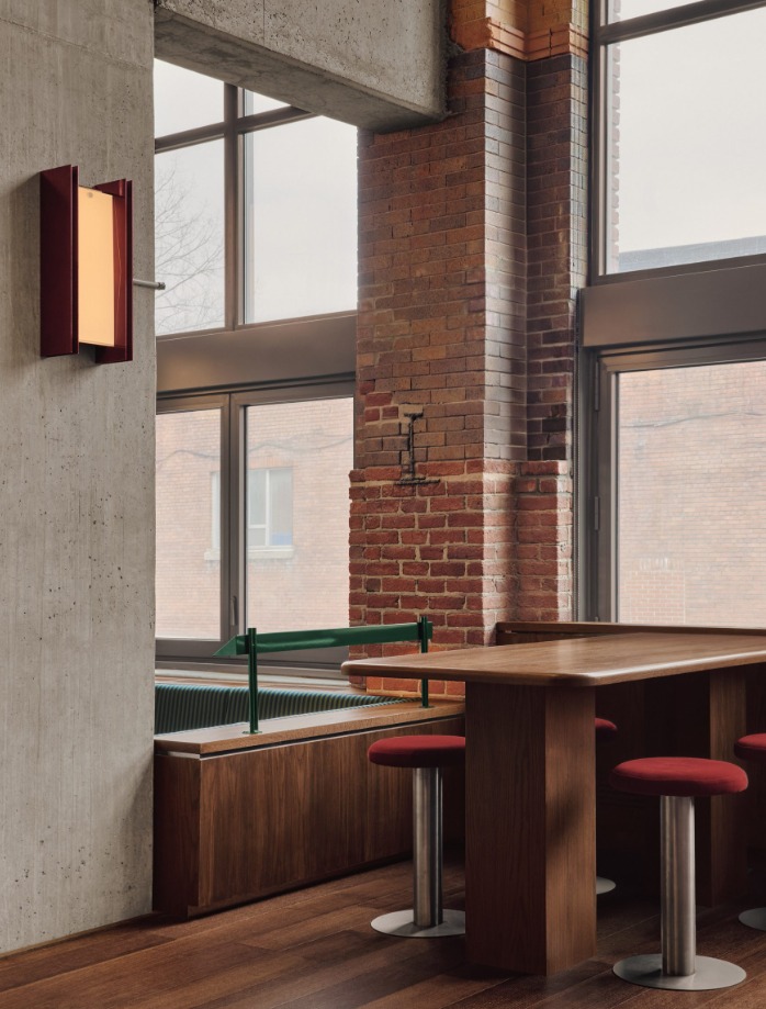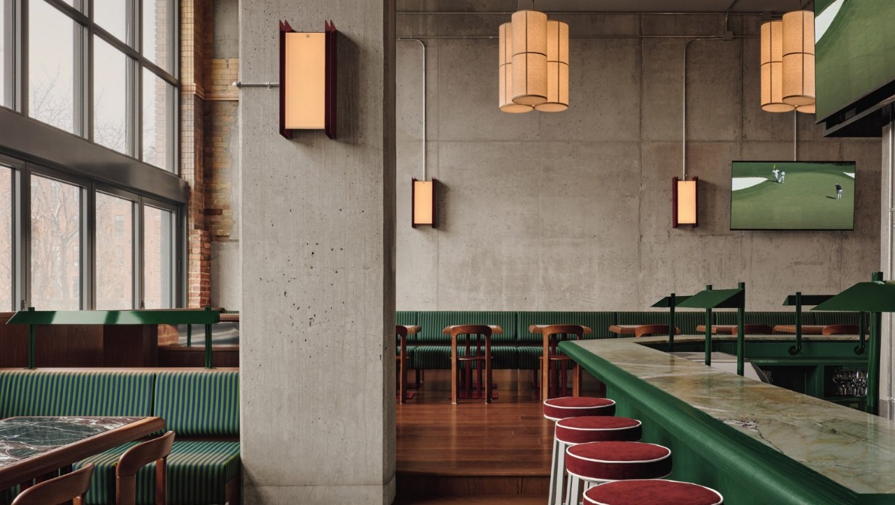 Klub golf indoor ini berdiri dalam sebuah bangunan industri bersejarah di Montréal yang telah berdiri sejak awal abad ke 20. Karakter asli bangunan sengaja dipertahankan. Dinding bata ekspos, pilar baja, dan lantai beton dibiarkan tampil jujur sehingga menghadirkan nuansa autentik yang kuat. Alih alih menghapus masa lalu, desainer justru memanfaatkannya sebagai fondasi atmosfer baru yang lebih elegan.