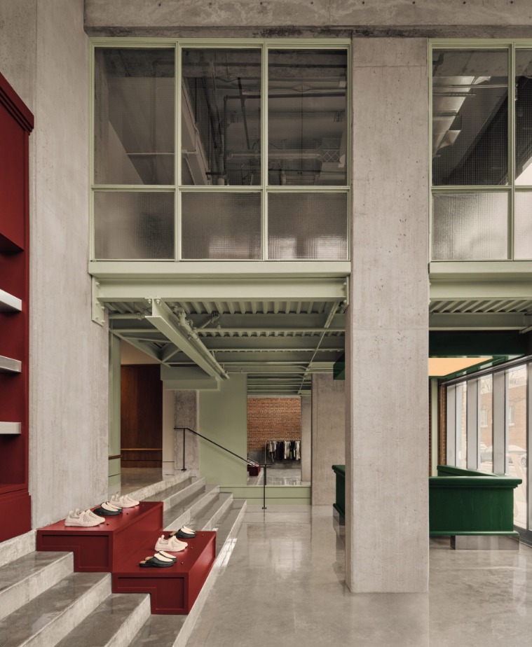 Tangga beton lama dipertahankan tetapi difungsikan ulang dengan cerdas. Anak tangga diubah menjadi display ritel yang memamerkan perlengkapan golf, menjadikannya elemen dekoratif sekaligus utilitarian. Konsep ini memperlihatkan bagaimana desain dapat menggabungkan fungsi dan estetika tanpa terasa berlebihan.
