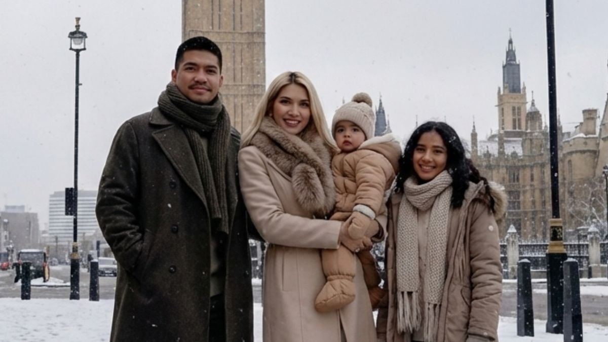 Ubah foto keluarga menjadi sedang berdiri di depan Big Ben saat musim salju. Gunakan outfit musim dingin coat panjang, syal, dan boots. Tampilkan suasana kota yang elegan dan klasik. Pertahankan wajah. Tambahkan efek langit mendung khas London dengan pencahayaan lembut. Resolusi gambar tinggi.