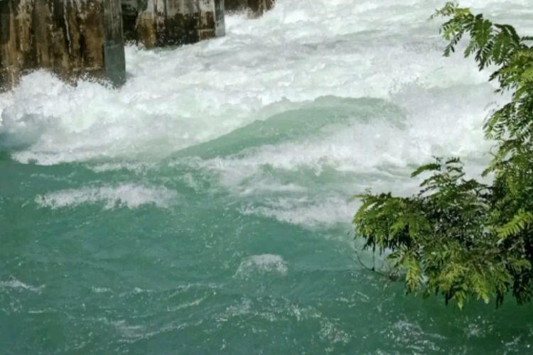 Dalam video yang tersebar di media sosial, terlihat aliran air dari Danau Singkarak itu berwarna biru dan mengalir dengan sangat deras.