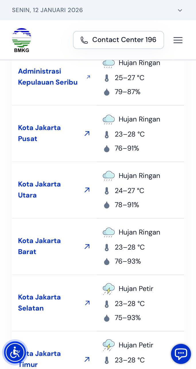 Berikut prakiraan cuaca di Jakarta hari ini 12 Januari 2026