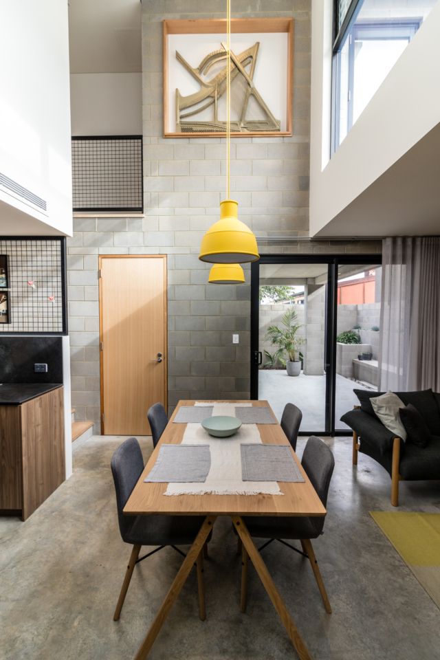 Mengutamakan ventilasi silang dengan jendela di dua sisi bangunan. Dua kamar berada di bagian belakang, sementara area depan terbuka untuk ruang keluarga dan dapur agar udara mengalir lebih baik.