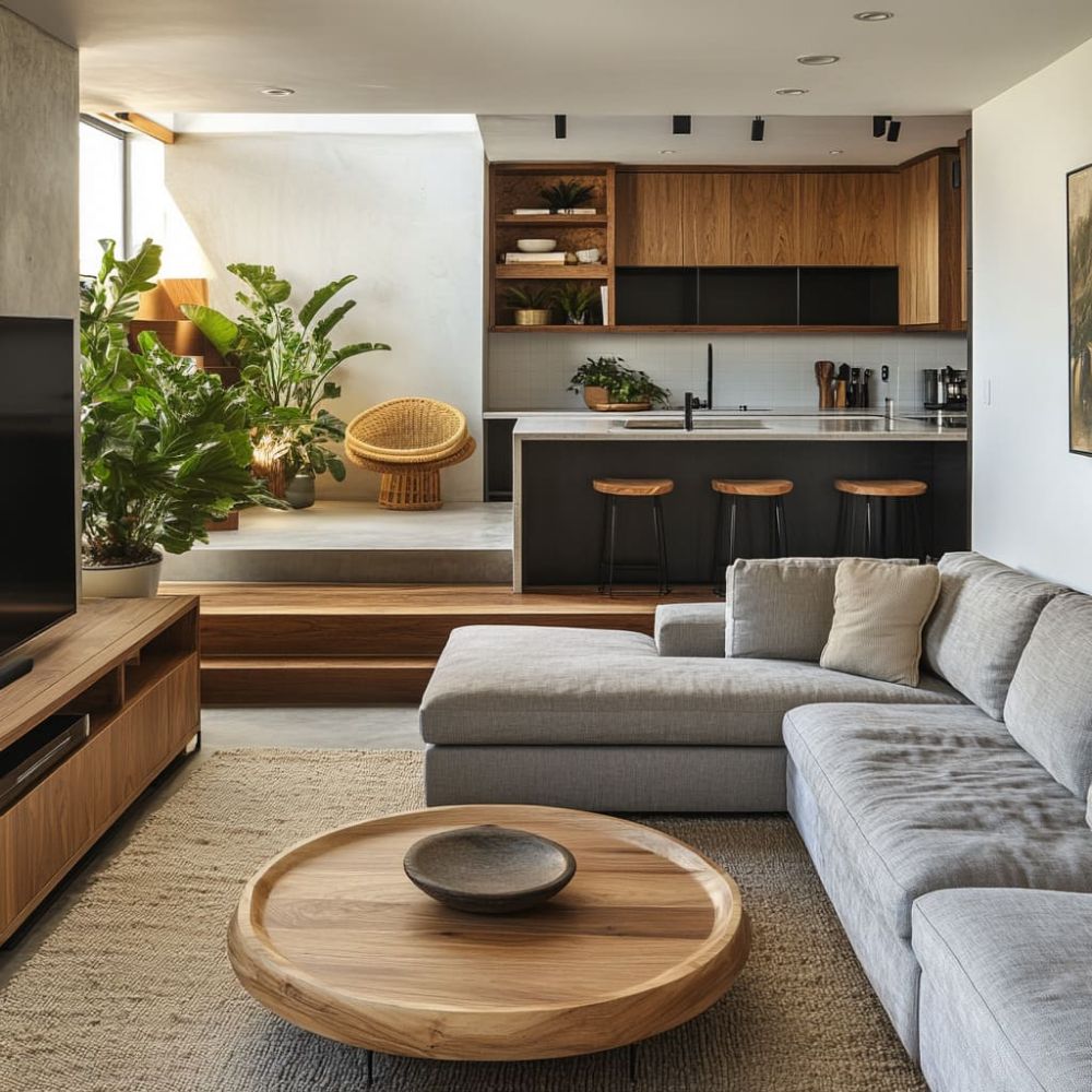 Area ruang tamu dan ruang keluarga sering dibuat menyatu agar rumah terasa lebih luas. Konsep open space ini memungkinkan cahaya alami masuk lebih maksimal serta menciptakan aliran udara yang baik. Dapur dan ruang makan biasanya berada di bagian belakang dengan akses langsung ke area servis atau taman kecil untuk ventilasi alami.