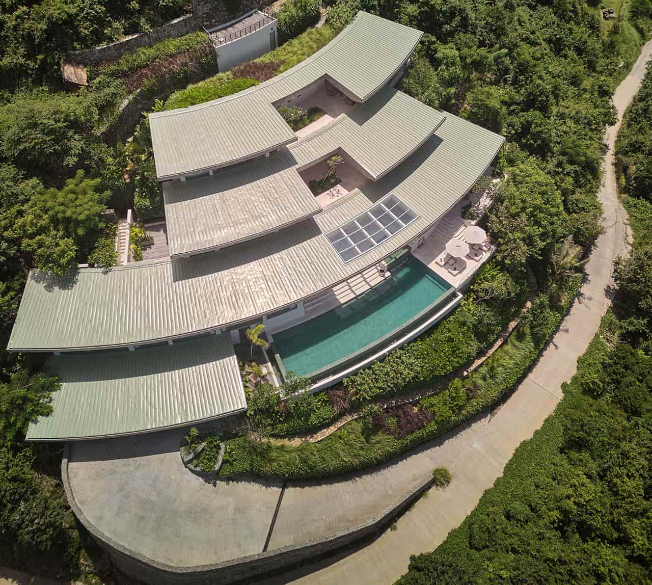 Area privat dibagi menjadi dua sayap hunian, masing-masing dirancang untuk satu keluarga. Konsep ini menghadirkan privasi tanpa menciptakan rasa terisolasi. Di puncak vila, terdapat paviliun yoga berbentuk lingkaran yang berfungsi sebagai ruang kontemplasi, menawarkan panorama perbukitan hijau dan laut yang menenangkan.